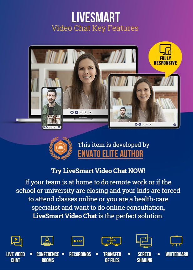 LiveSmart Video Chat is a standalone web application with video, audio, recording, screen sharing and file transfer face-to-face communication channels and integrated chat. The product does not require any additional installations or third party logins and accounts. You can set a highly customizable video conferencing tool with tons of features.